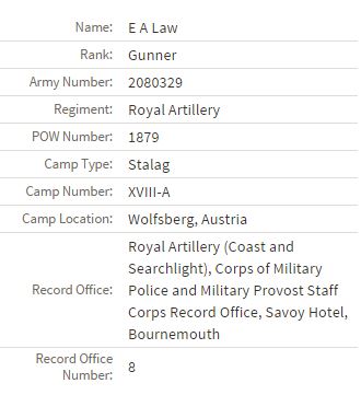 Gunner Ted Law was a member of the Royal Artillery, Service No 2080329, POW 1879. Source: UK, British Prisoners of War, 1939-1945 accessed through Ancestry.com.
